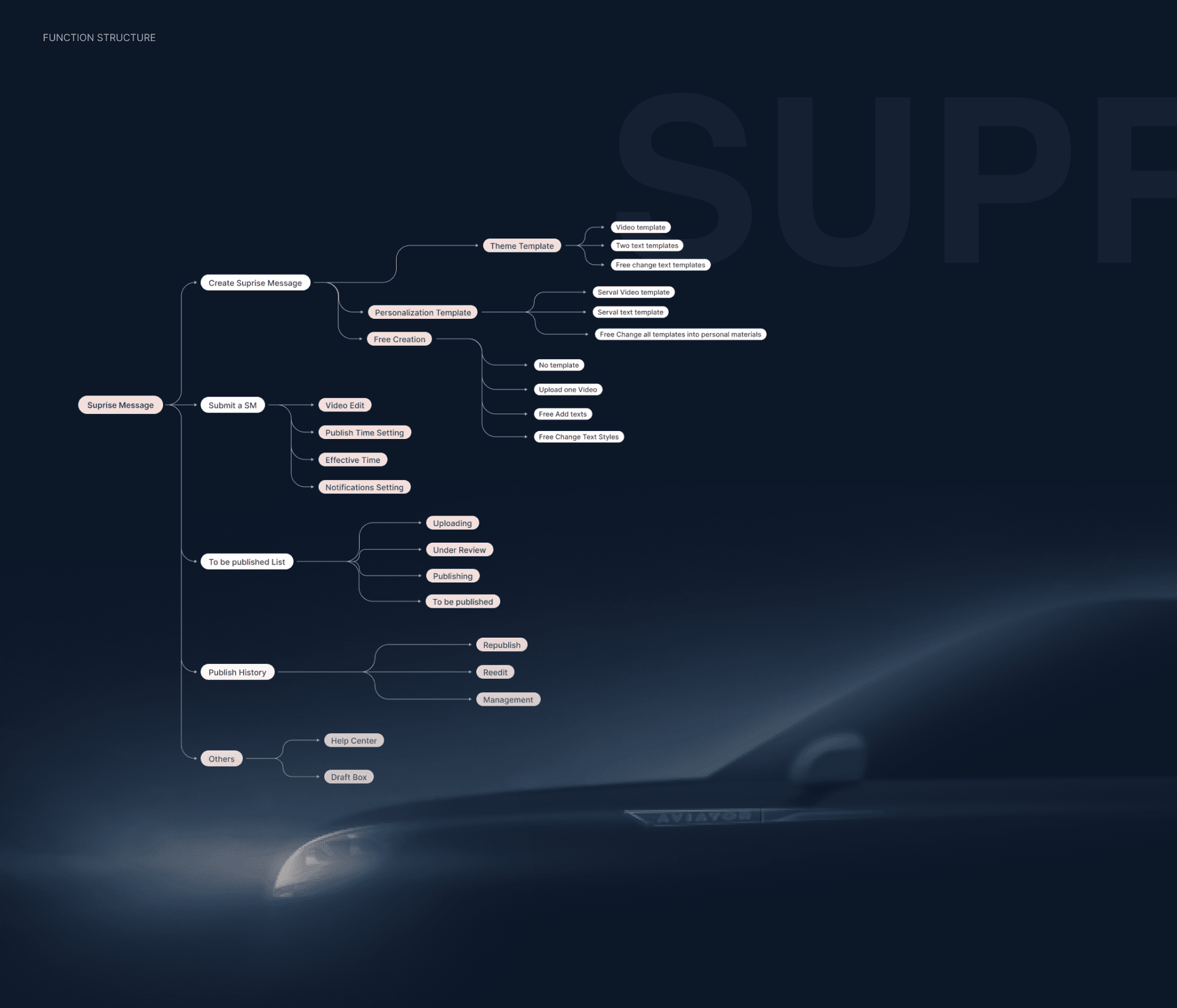 Redefining the Surprise Message Function for Lincoln to elevate how users leverage in-car space for emotional expression, ceremony, and connection. By integrating the vehicle’s interior, large screen, and sound system, we crafted a unique time-travel experience, turning the car into a mobile space for heartfelt messages. This human-centered design deepens bonds between people and their vehicles, fostering more meaningful relationships.